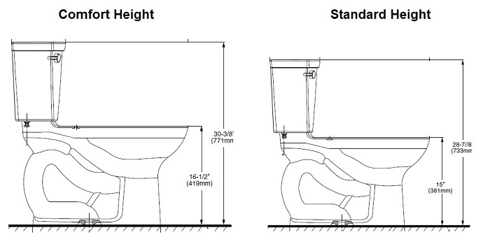 A standard new toilet is around 14.5” from the bowl to the rim (not including seat). A comfort height toilet is around 16-19” depending on the brand. This increase in height can help people with sitting and then standing up, and are particularly helpful for the elderly.